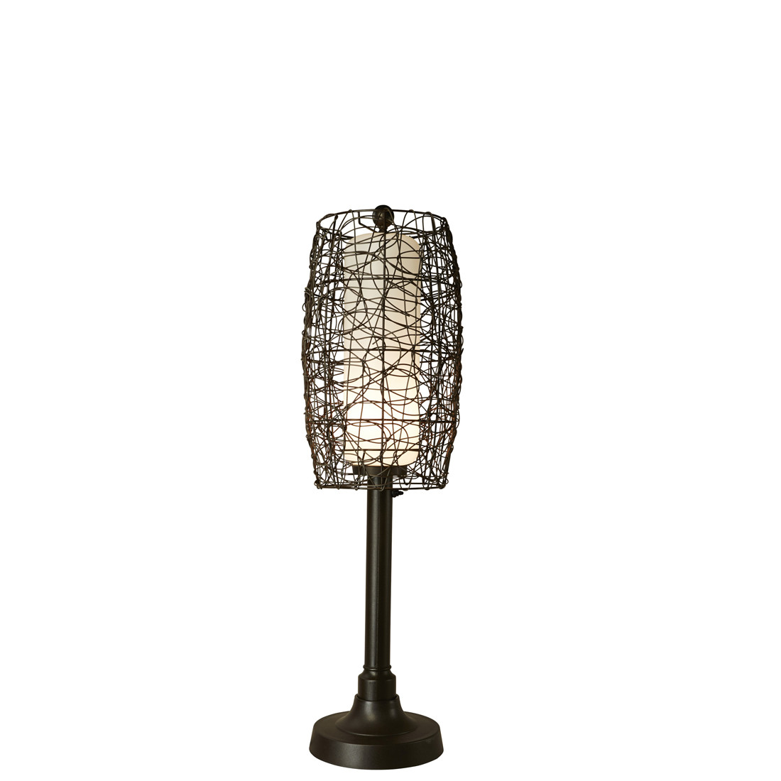 Hand woven random weave walnut PVC wicker barrel shade enclosing an opal cylinder of light highlight these carefree durable contemporary outdoor lamps.