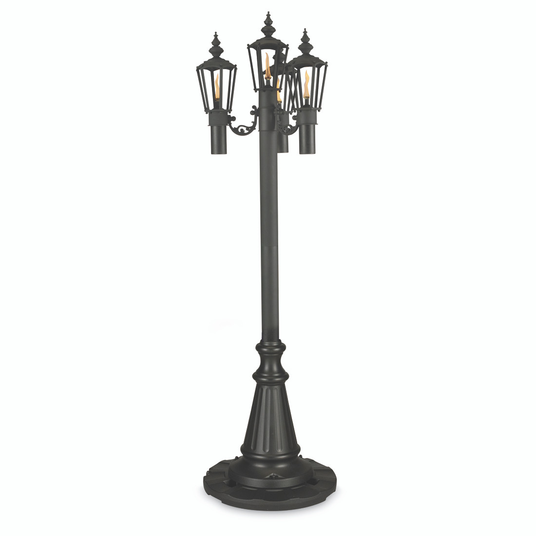 The charming style of these citronella flame lanterns is reminiscent of a turn-of-the-century gas street lamp with today's up-to-date efficiency and quality. Easy fill containers use standard lamp oil or citronella liquid paraffin fuel to repel insects (16 oz. filling will last an entire evening, over 10 hours) and have lifetime fiberglass wicks. 85" tall, 22" dia. base holds 40 lbs. of sand (sand not included). Black Texture Finish.